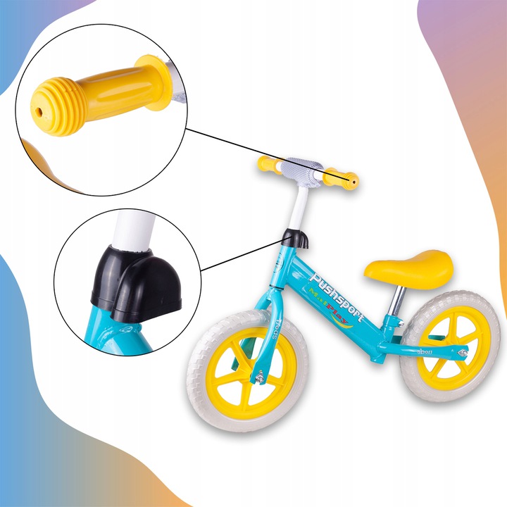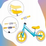 Bicicleta copii fara pedale cu roti de 12 inch din spuma EVA, cu scaun si ghidon reglabile in inaltime, Push Sport Galben/Albastru, inaltime sezut 29-34 cm, de la 3 ani, inaltime recomandata 80-108 cm