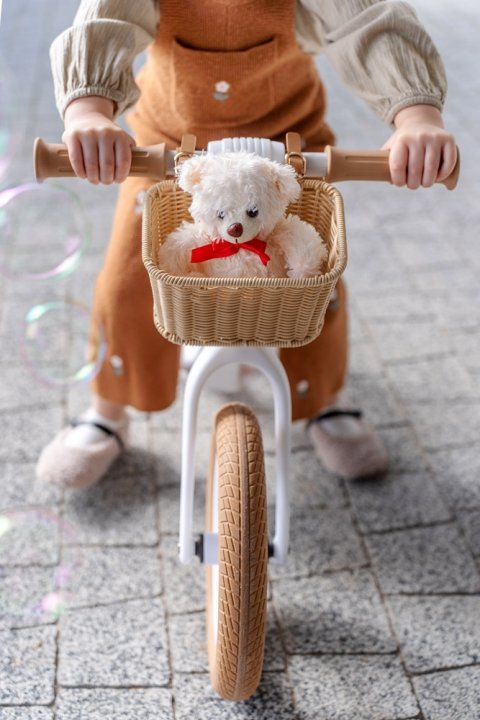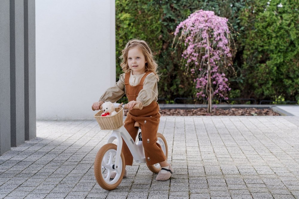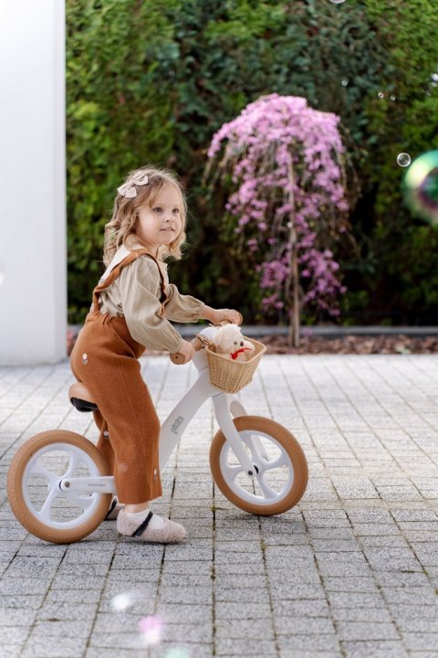 Bicicleta fara pedale pentru copii, Adamex Pixie, cu roti de 12 inch din spuma PU, cu cosulet, design retro, scaun reglabil, inaltime sezut 33-43 cm, sarcina maxima admisa 50 kg, 2-6 ani, Snow White