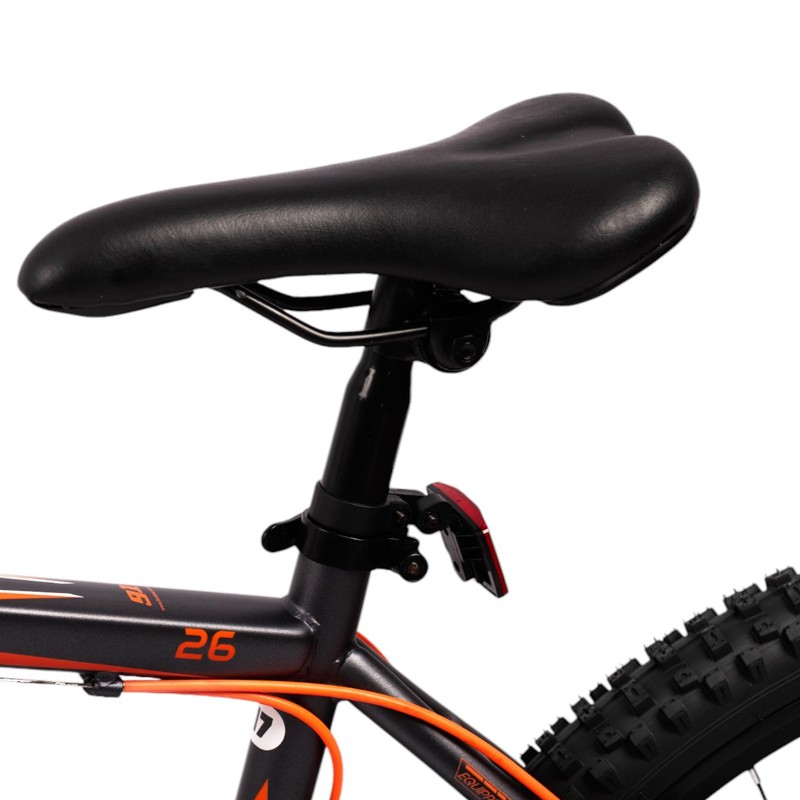 Aceasta bicicleta MTB (Mountain Bike) este conceputa pentru cei care isi doresc sa exploreze trasee montane, drumuri accidentate sau chiar plimbari in oras, combinand performanta cu confortul. Designul sau modern in culorile negru si portocaliu aduce un aspect sportiv si dinamic, iar componentele de calitate garanteaza o experienta sigura si placuta.