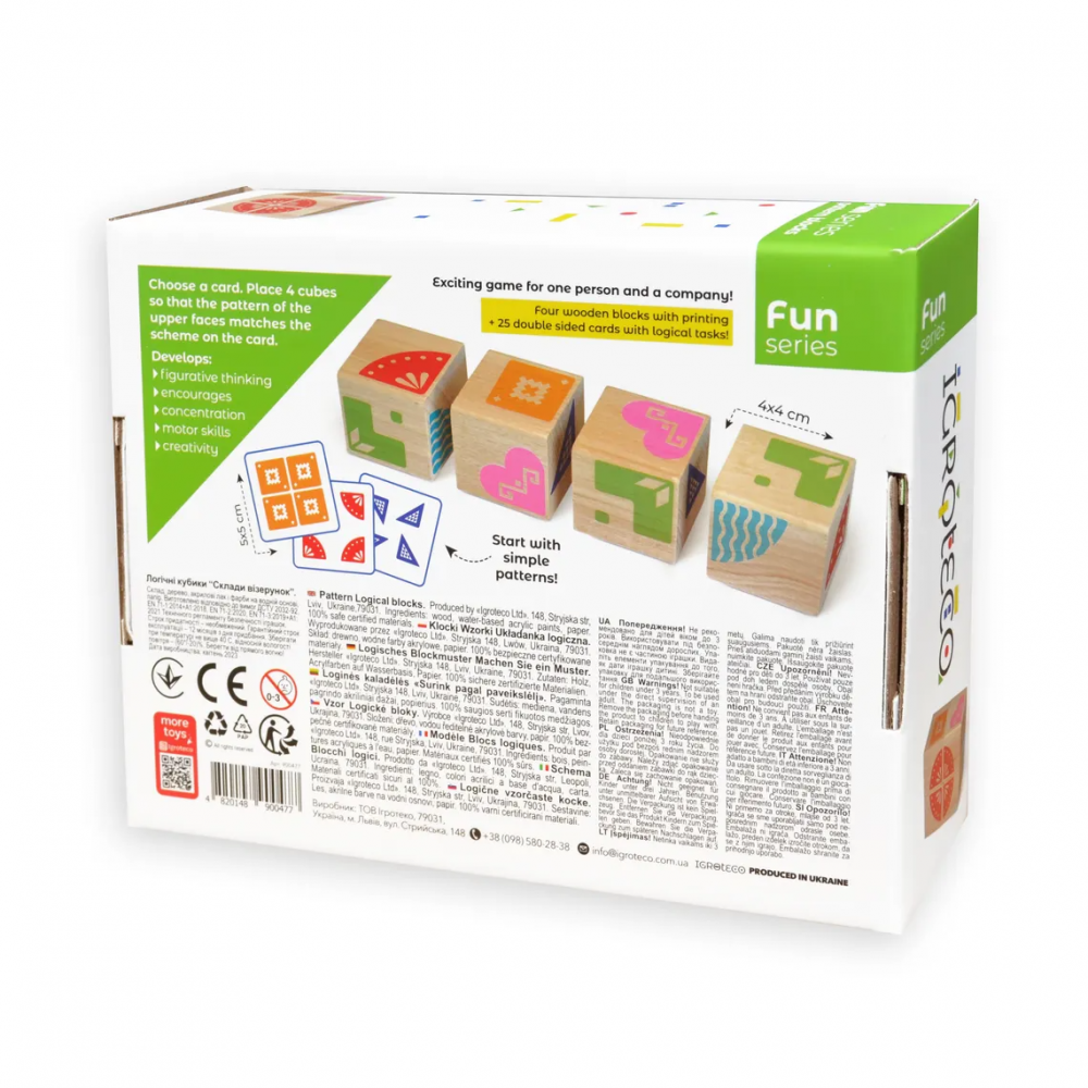 - Conținutul setului – 4 cuburi din lemn și o broșură cu 50 de modele pentru asamblare.