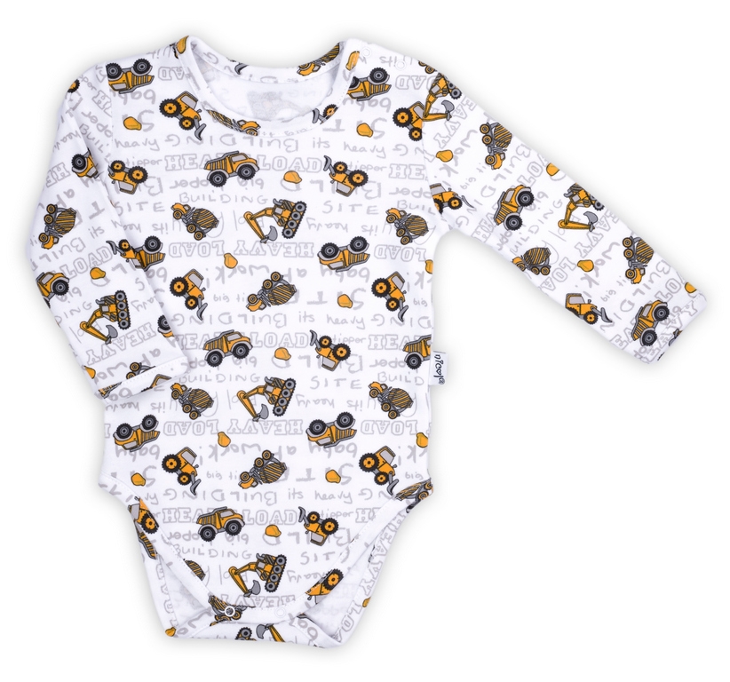 Body cu maneca lunga, realizat din bumbac alb cu motive cu utilaje, certificat de Oeko -Tex Standard 100 Trustworthy in textiles.