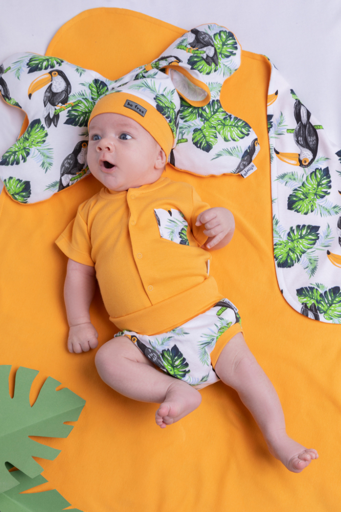 Produsul este inchis in fata cu nasturi, intre picioare cu capse fara nichel si are un guler cusut si un buzunar din material cu imprimeu Tucan.