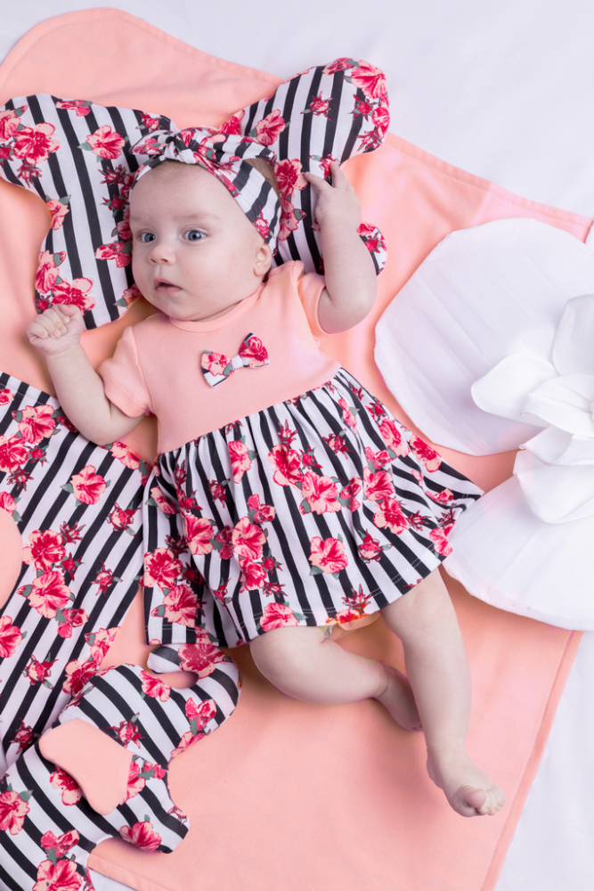 Partea superioara este realizata din bumbac roz si este decorata cu o funda in fata.
