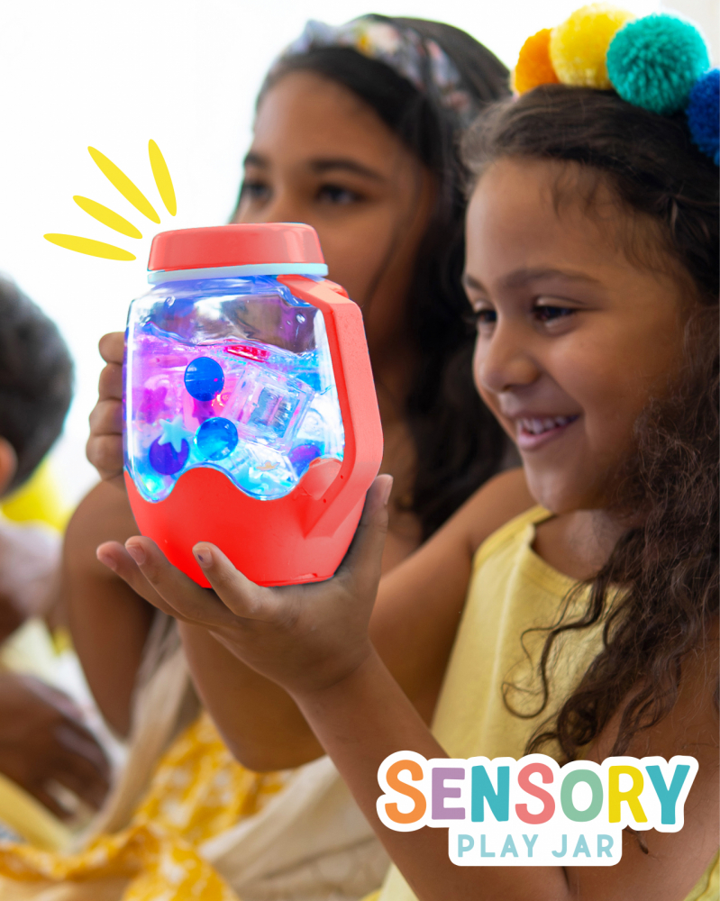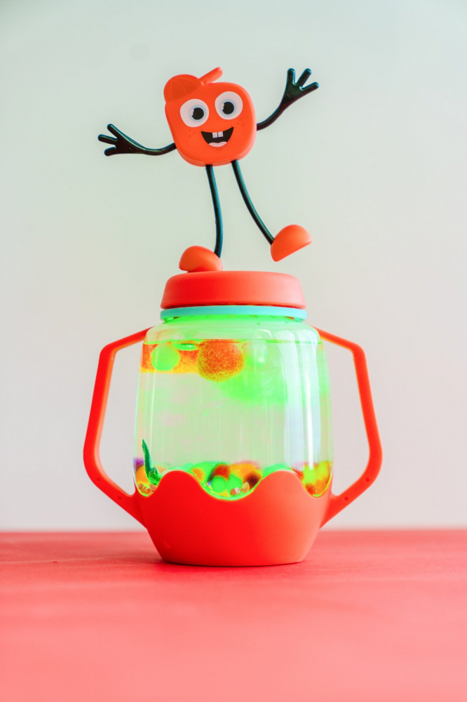 - Adăugați accesoriile senzoriale preferate ale copilului dvs. și umpleți cu apă pentru a activa funcția de iluminare a borcanului.