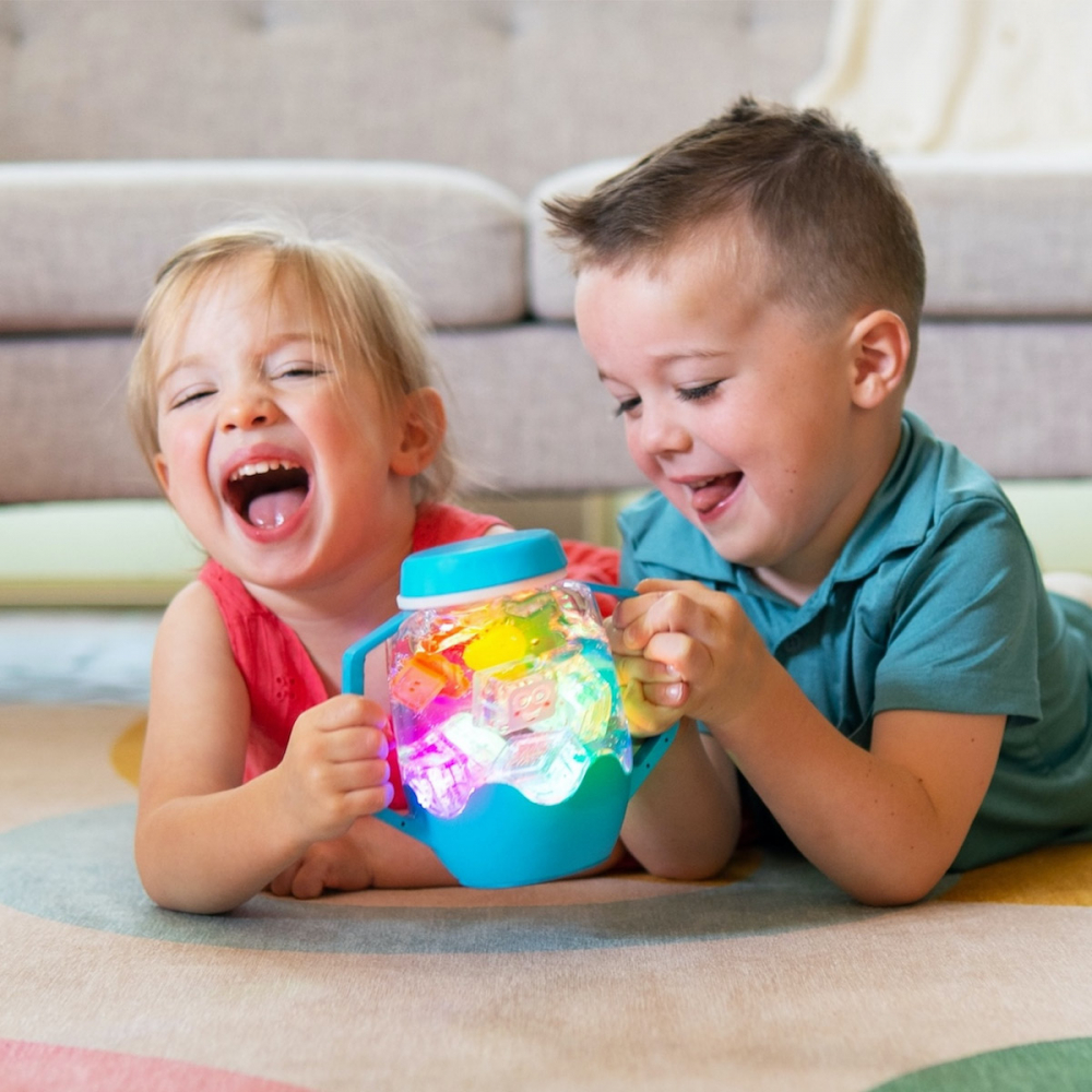 Atingeți pentru a schimba culorile și pentru a face lucrurile și mai amuzante, umpleti borcanul de joacă senzorială cu alte elemente magice, cum ar fi cuburile Glo Pals - toate închise ermetic cu ajutorul capacului rezistent la vărsare.