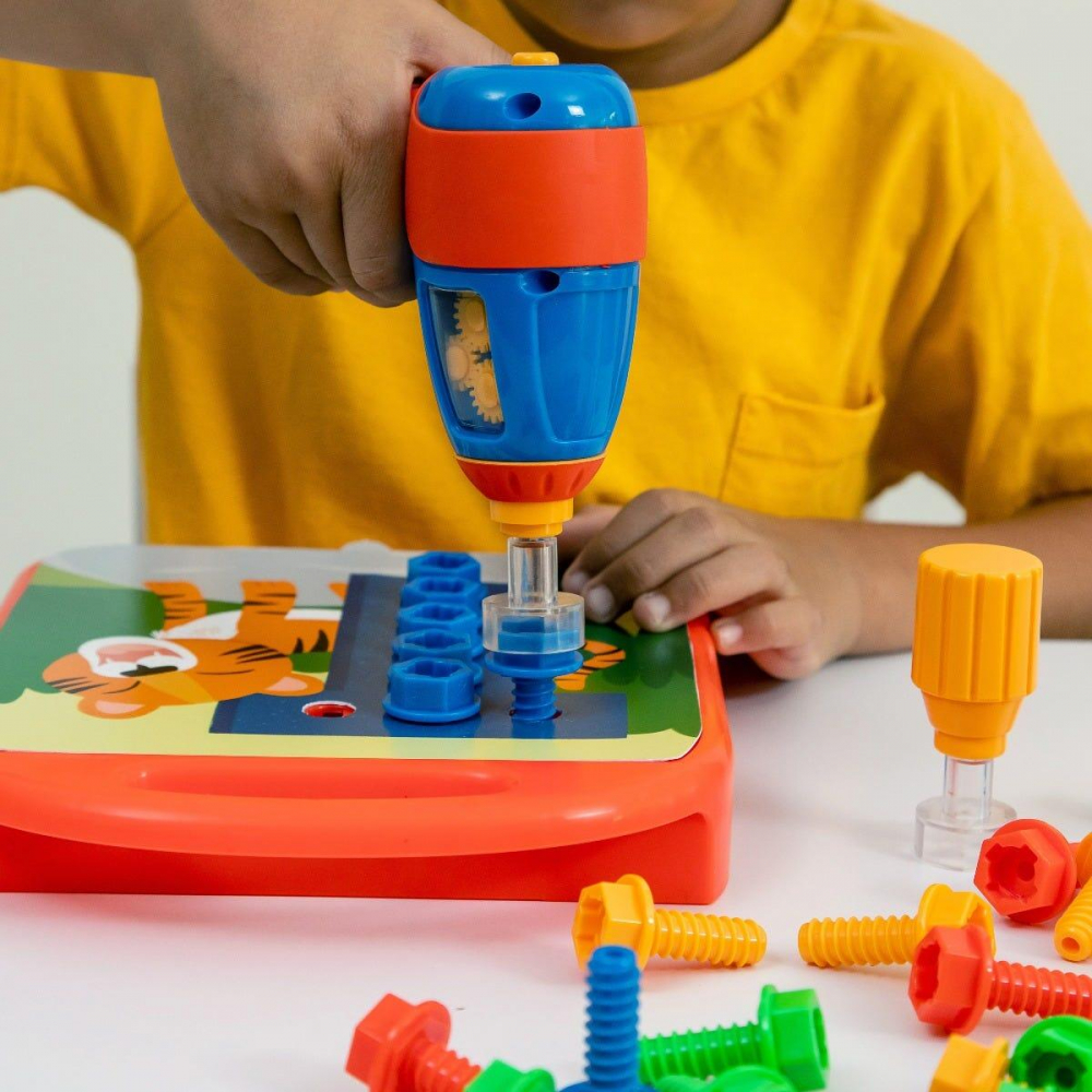 potriveste pe tablita de joc unul din cardurile incluse cu litere sau numere, apoi foloseste bormasina si suruburile colorate pentru a recrea litera sau numarul afisat