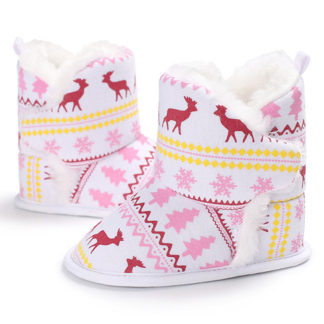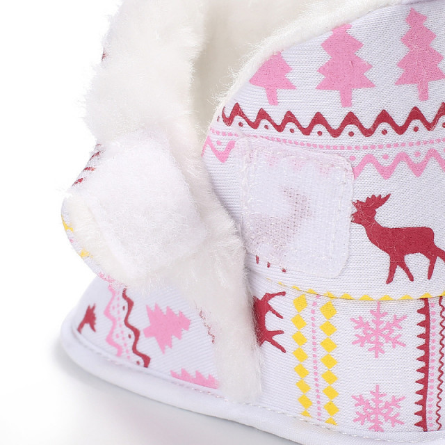 Botosei pentru fetite, din material textil, imbaniti in interior, imprimati cu reni, fulgi de zapada si braduti Se inchid cu arici intr-o parte.