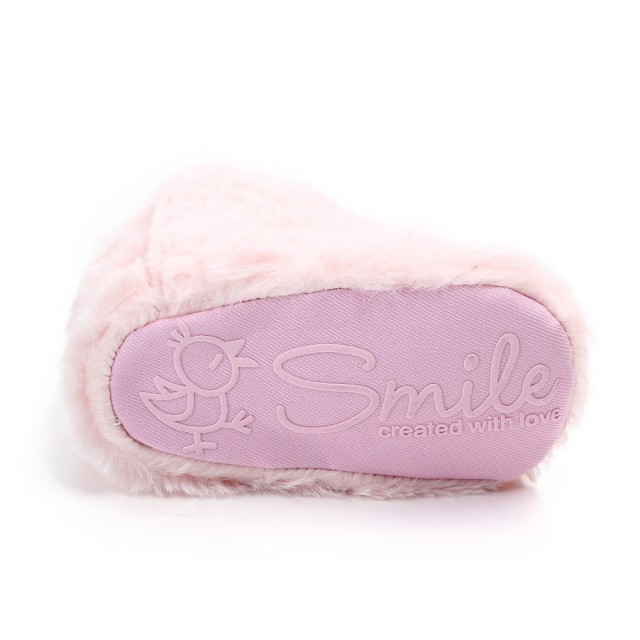Cizmulite roz din blanita pentru bebelusi, in forma de soricel, se inchid cu arici.