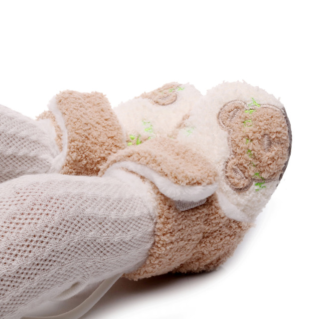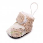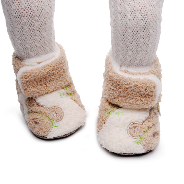 Botosei imblaniti pentru bebelusi, din blanita, cu un cap de ursulet aplicat intr-o parte, se inchid cu bareta lata cu arici.