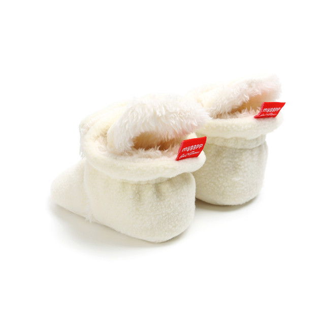 Model: botosei pentru bebelusi din material plusat, imblaniti, sunt prevazuti cu elastic la spate, se inchid cu bareta lata cu capse.