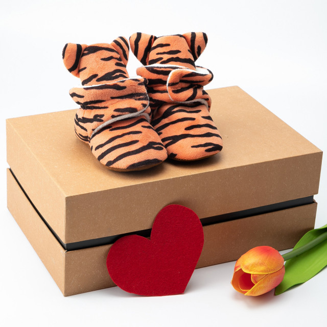 Model: botosei pentru bebelusi din material textil plusat, cu imprimeu tigrisor, sunt prevazuti cu elastic la spate, se inchid cu bareta cu arici