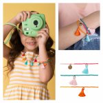 Un set de 3 bratari vibrante, multicolore, cu margele, are accente de ciucuri pufosi in nuante stralucitoare.