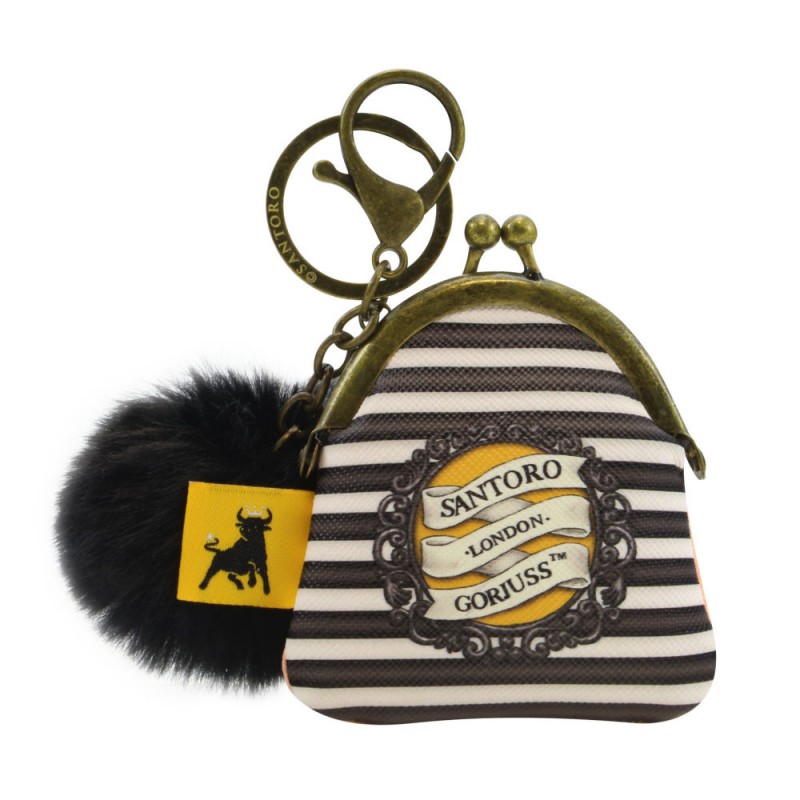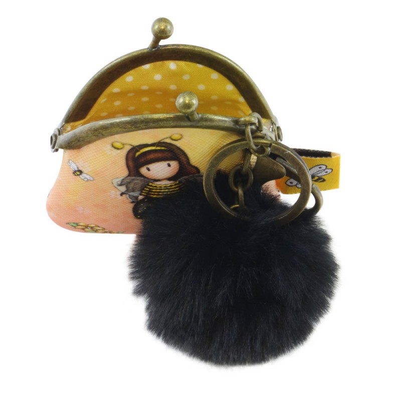Acest breloc este realizat din material cu efect de piele si are imprimat un design Gorjuss cu micuta Bee Loved in nuante de galben, corai si negru. De asemenea, langa gentuta este atasat si un puf negru potrivit cu fetita Gorjuss. Brelocul tip gentuta are sistem de prindere cu inel dar si un clestisor. Gentuta se deschide si interiorul este din material textil galben cu buline.