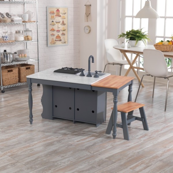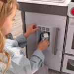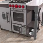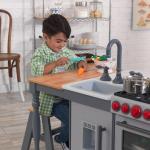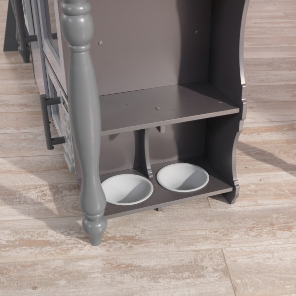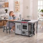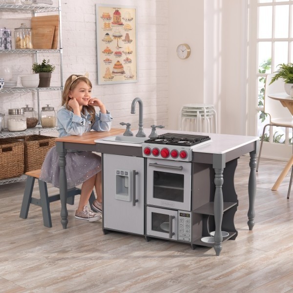Aceasta bucatarie moderna incanta bucatari cu caracteristicile sale unice, care includ un design interactiv, o estetica frumoasa din lemn si un mic loc pentru a hrani animalele de companie!