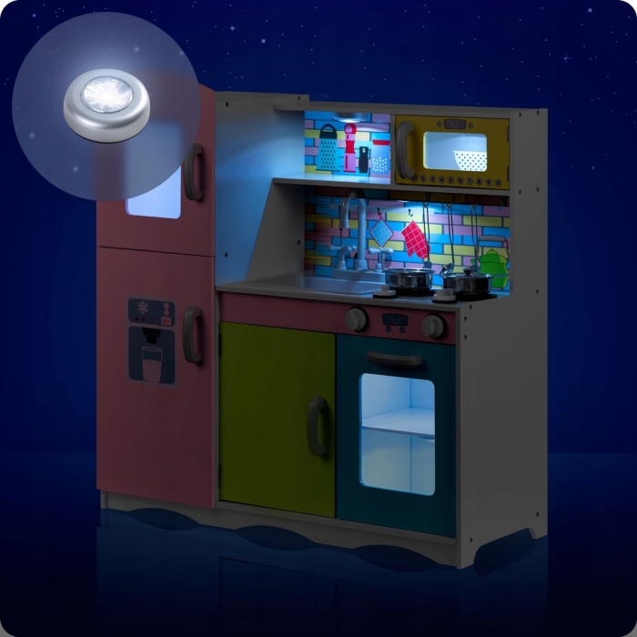 Bucataria este o jucarie educativa care ii va permite copilului tau sa se simta ca intr-o bucatarie adevarata. Datorita usilor care se deschid, butoanele aragazului care se invart si vaselor, copilul se va distra de minune dezvoltand abilitatile manuale in acelasi timp.