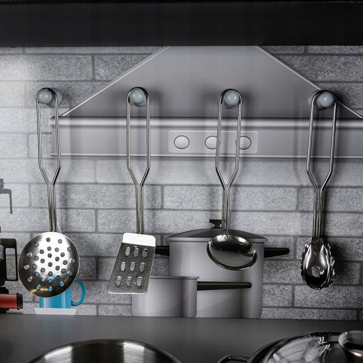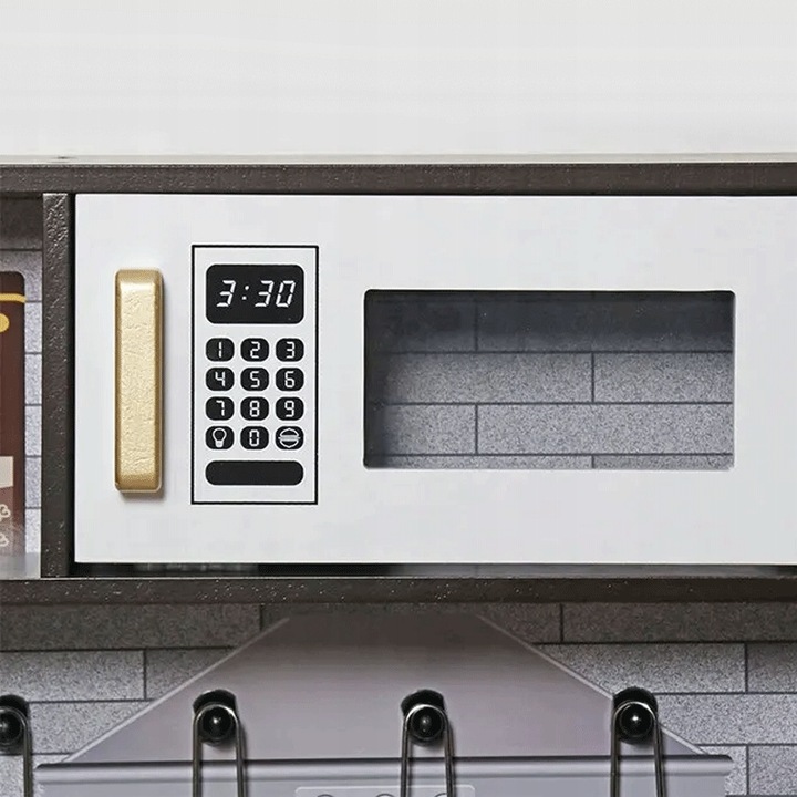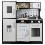 * Setul include elemente de baza precum plita, chiuveta, cuptor, cuptor cu microunde, frigider si accesorii de bucatarie (oala, tigaie, tacamuri), astfel incat cei mici sa poata recrea activitatile culinare de zi cu zi.