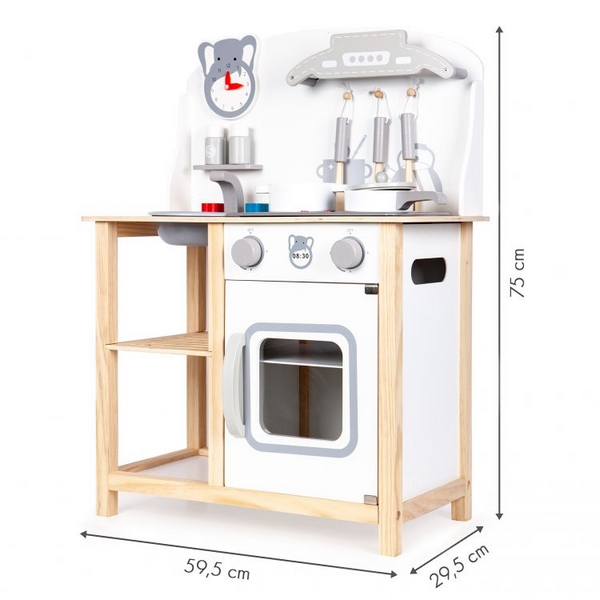 - Bucataria Ecotoys din lemn este dotata cu: rafturi, aragaz, cuptor si chiuveta