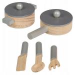 - 7 accesorii de bucătărie din lemn : tigaie, oală cu capace, unelte de bucătărie