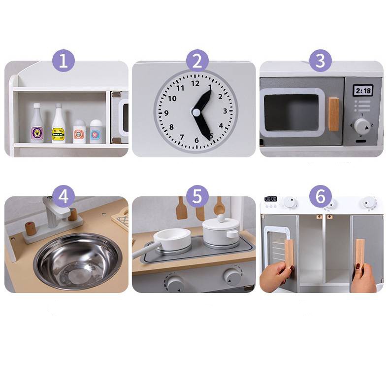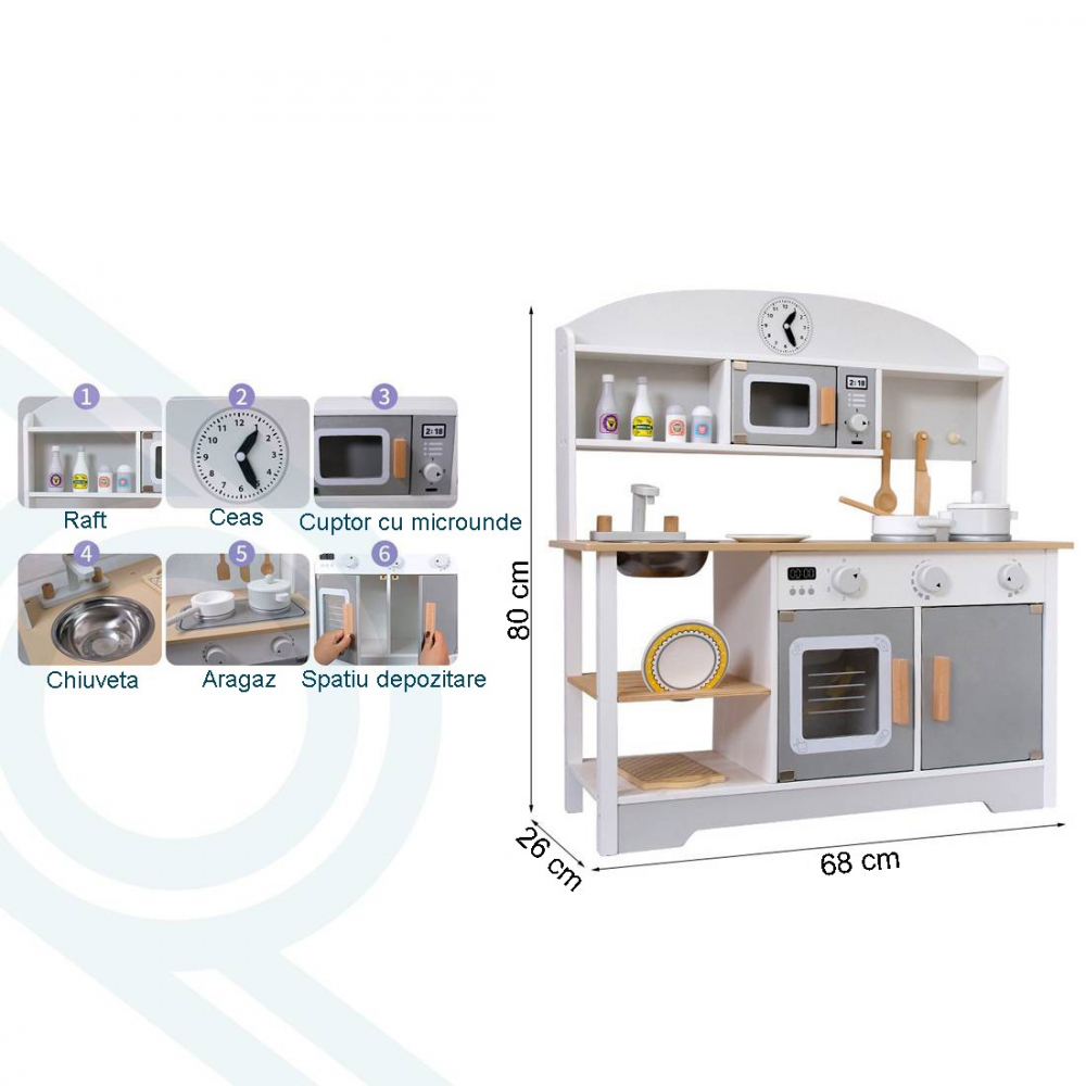 Realizata din lemn durabil, aceasta bucatarie este sigura si rezistenta, asigurand ore nesfarsite de joaca creativa. Designul sau atractiv si culorile placute fac din ea un cadou perfect pentru copiii cu varsta de peste 3 ani, oferindu-le o experienta de joaca autentica si educativa, imitand activitatile de zi cu zi dintr-o bucatarie reala.