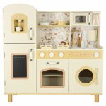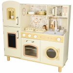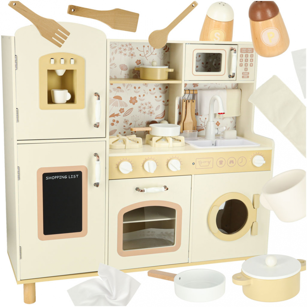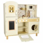 Jucandu-se cu o bucatarie din lemn, copilul invata abilitati de baza legate de pregatirea meselor, curatarea si organizarea spatiului.