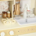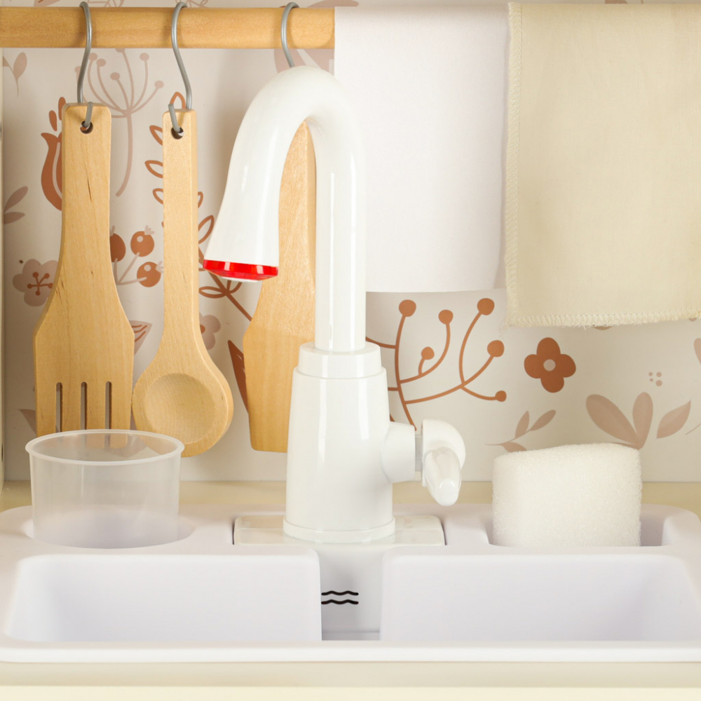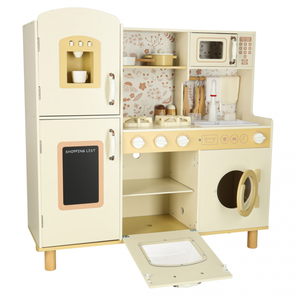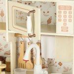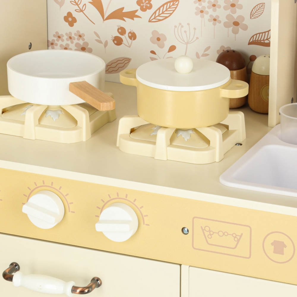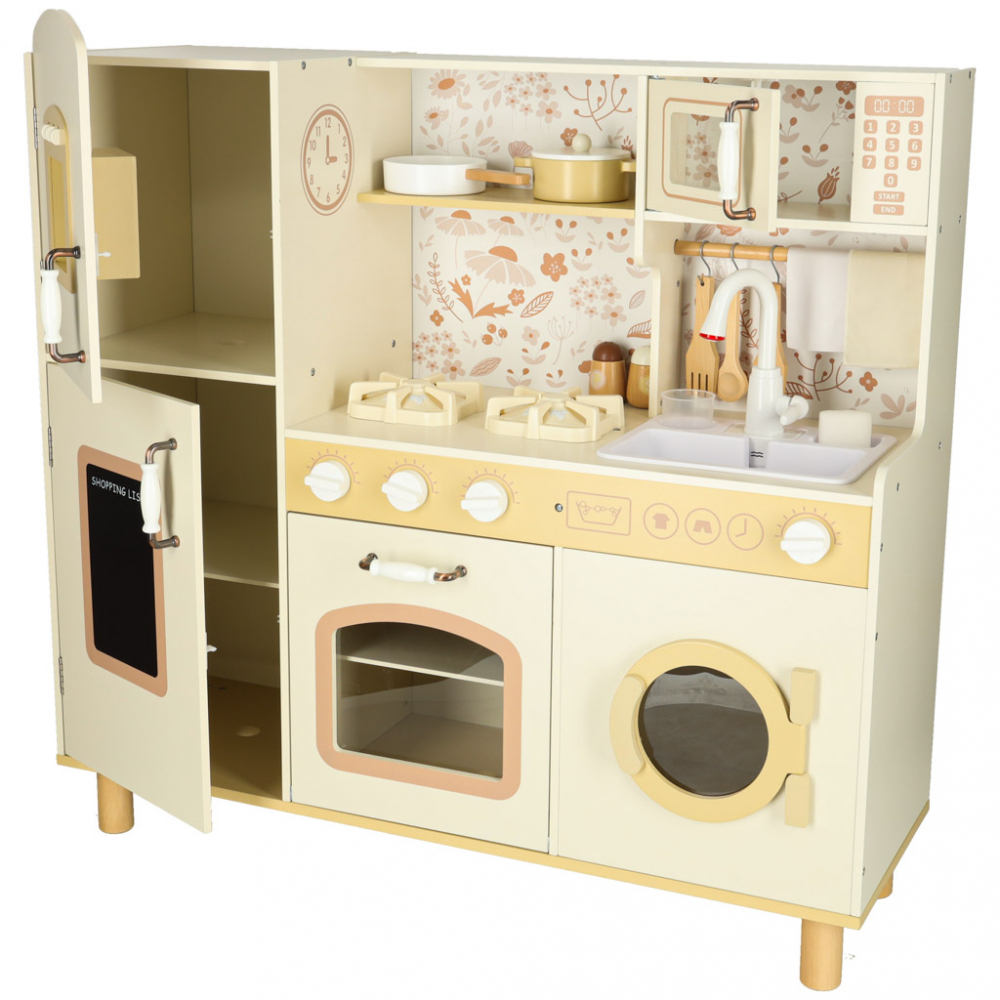 Jucandu-se cu o bucatarie din lemn, copilul invata abilitati de baza legate de pregatirea meselor, curatarea si organizarea spatiului.