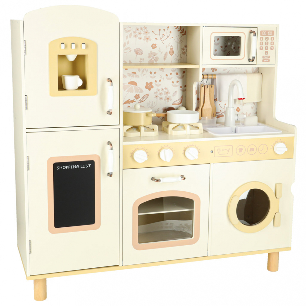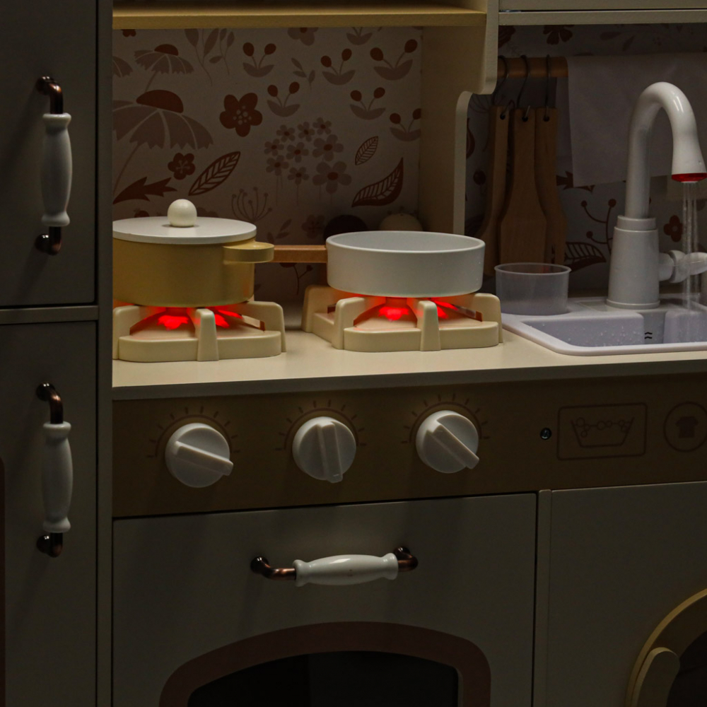 Setul include elemente interactive: arzatoare cu efecte sonore si luminoase, un cuptor cu deschidere, un cuptor cu microunde, o masina de spalat, o chiuveta cu functie de debit de apa, dulapuri, o tabla de notite, un ceas pictat si accesorii: o oala, tigaie, spatule, ceasca si condimente.