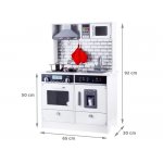 Aceasta bucatarie de joaca din lemn, solida si complet utilata, este tot ce are nevoie un mic pasionat de gatit.