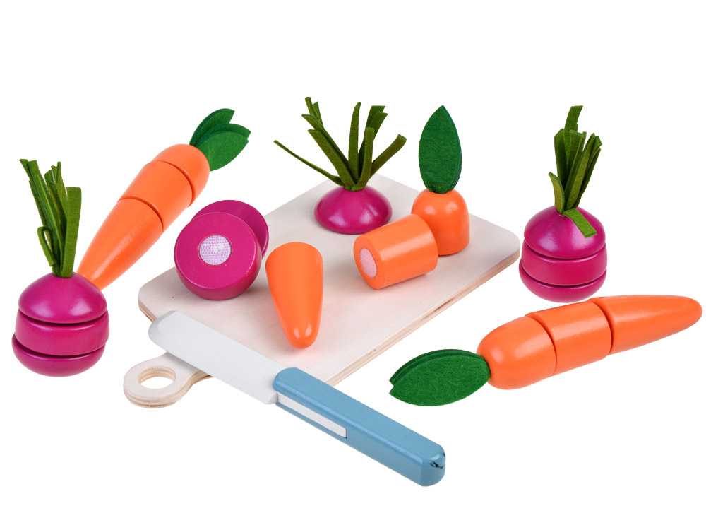 Jucarii Alimentare: Legume de jucarie cu velcro, gata de taiat: 3 morcovi si 3 sfecle rosii (cu frunze din material textil).