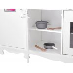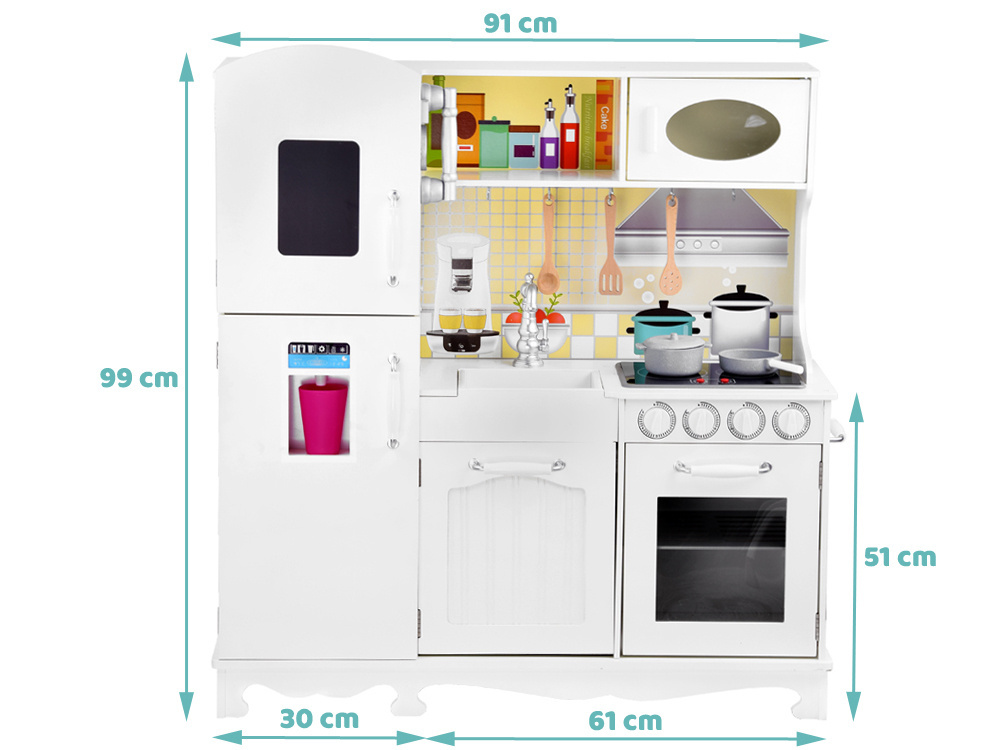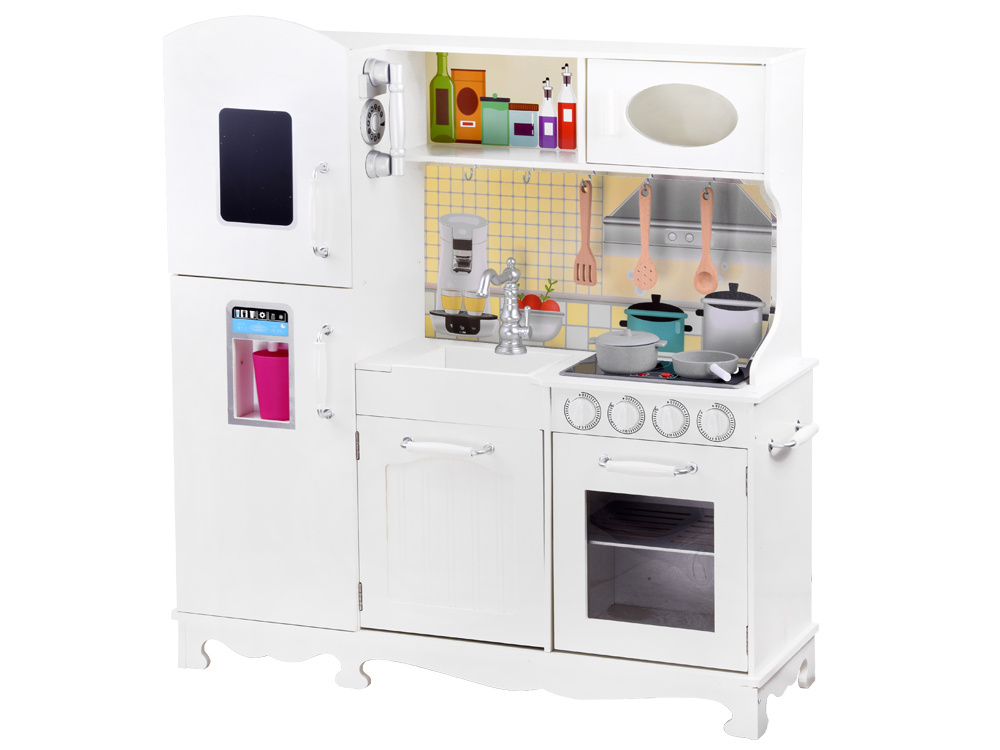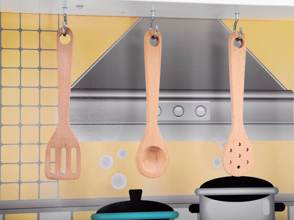 Aceasta bucatarie mare, realizata din lemn, creeaza un spatiu de joaca ideal pentru ca fetitele si baieteii sa pregateasca "festinuri" de neuitat pentru papusi sau prietenii de plus.