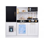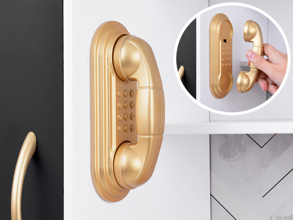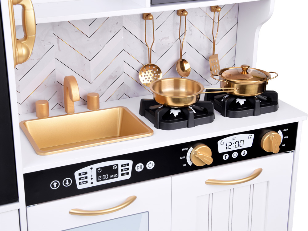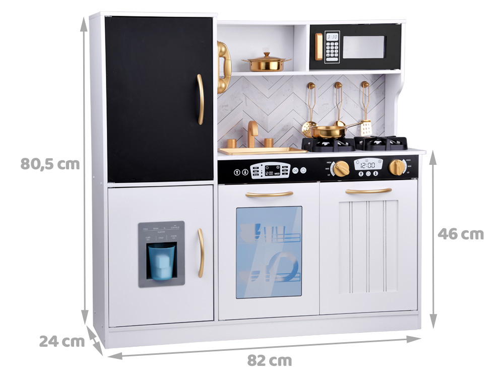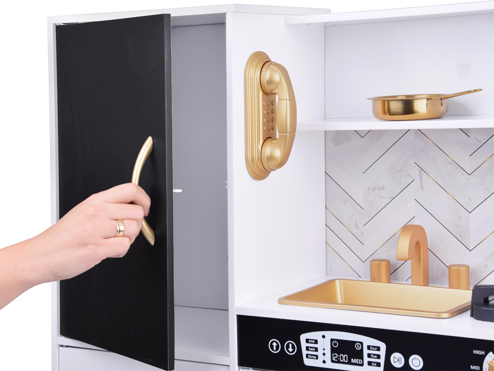 Bucatarie din lemn pentru copii Glamour, cu efecte sonore si luminoase, telefon retro, cuptor cu microunde, dimensiune 80.5 x 46 x 24cm si accesorii specifice incluse