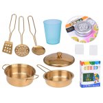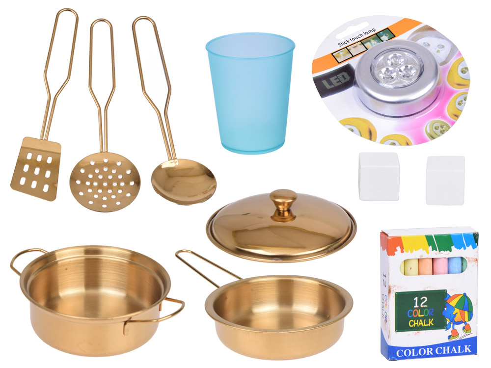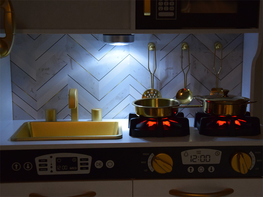 Arzatoare (2 buc.): Cu efecte sonore si luminoase. Cand se asaza o oala, se aud sunetele de gatit/prajit, insotite de o lumina rosie care imita flacarile.