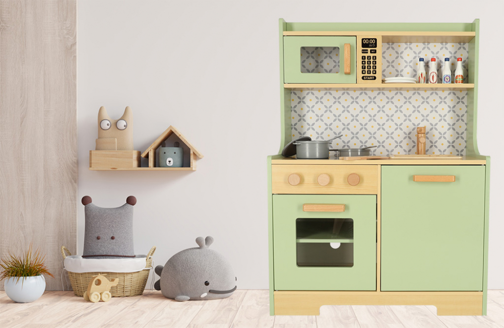 Copiii adora sa-si imite parintii, mai ales in bucatarie! O bucatarie din lemn de culoarea mentei este locul ideal unde micutii pot descoperi secretele gatitului, dezvoltandu-si creativitatea si invatand noi abilitati.