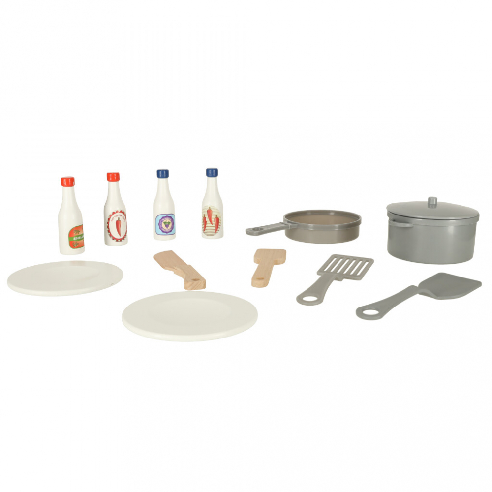Setul include o varietate de ustensile pentru o experienta de joc completa: o oala cu capac, o tigaie, tacamuri, farfurii, spatule si chiar patru sticlute de "sos" cu grafica amuzanta, perfecte pentru a adauga un plus de savoare preparatelor.