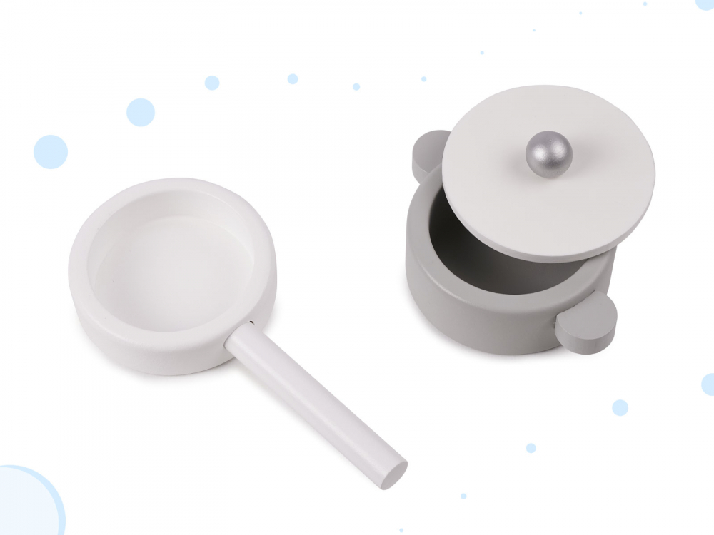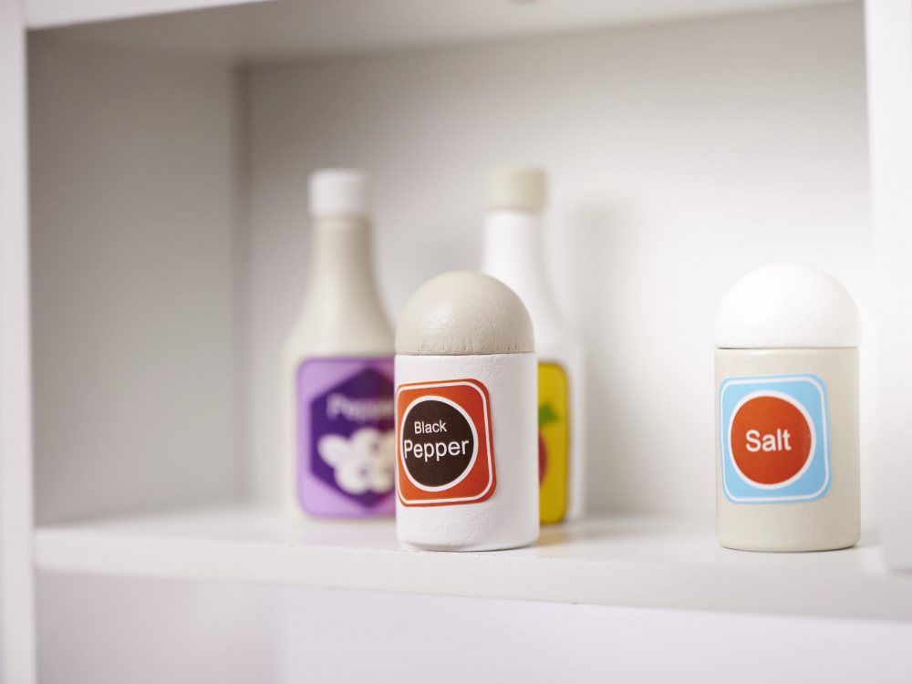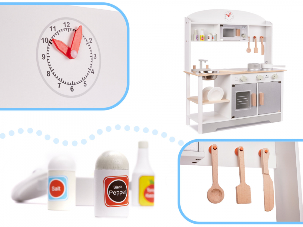 Toate elementele (cu exceptia chiuvetei) au fost realizate din lemn. Totul a fost slefuit cu grija si acoperit cu vopsea non-toxica - totul pentru siguranta copilului tau.