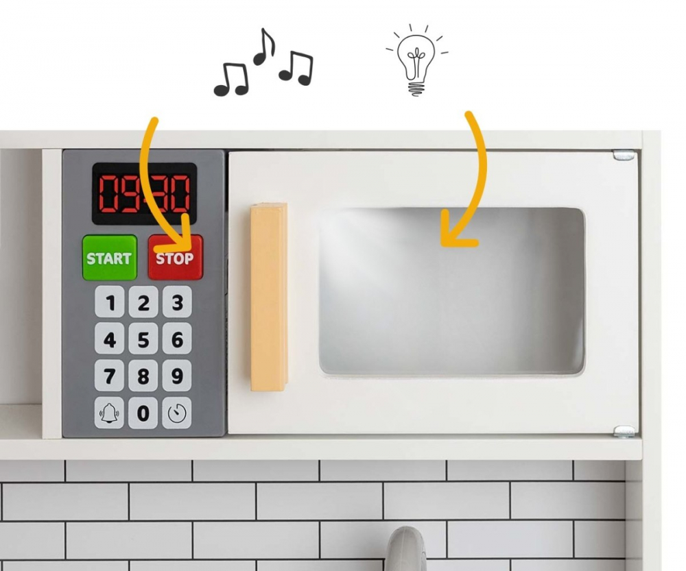 Fabricata din lemn de calitate, in nuante de gri si alb, completate de accente aurii, aceasta bucatarie se integreaza perfect in orice camera de copil si ofera o experienta autentica de joc de rol.
