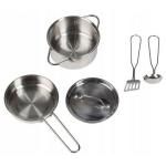 5 accesorii de bucatarie din aluminiu : tigaie, oala cu capac, 2 palete cu gauri pentru strecurat si un polonic