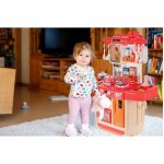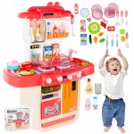 Setul are un robinet care functioneaza ca unul adevarat! Pentru ca robinetul sa functioneze, turnati apa in chiuveta si apoi apasati butonul din spatele robinetului, apoi apa va incepe sa curga de la robinet.