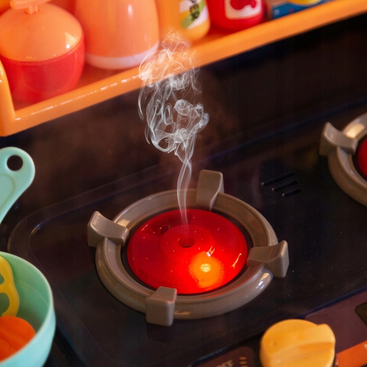 Abur la gatit: bucataria noastra emite abur inofensiv din arzatoare, ceea ce adauga autenticitate si dezvolta imaginatia in timpul jocului. Cei mici vor putea pregati mancaruri imaginare ca adevarati maestri bucatari.