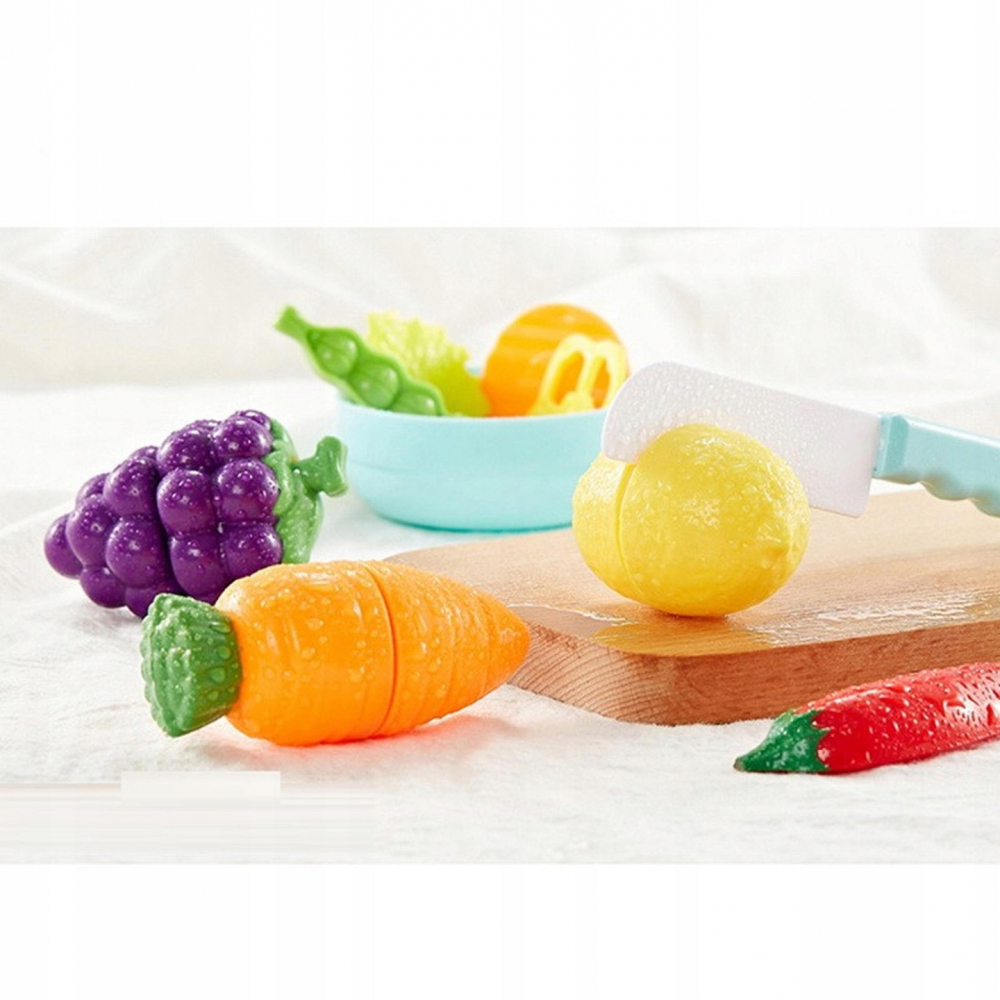 Cand taiati legume si fructe, copilul dumneavoastra va auzi un sunet distinctiv. Acest lucru se datoreaza combinatiei de legume si fructe cu Velcro.