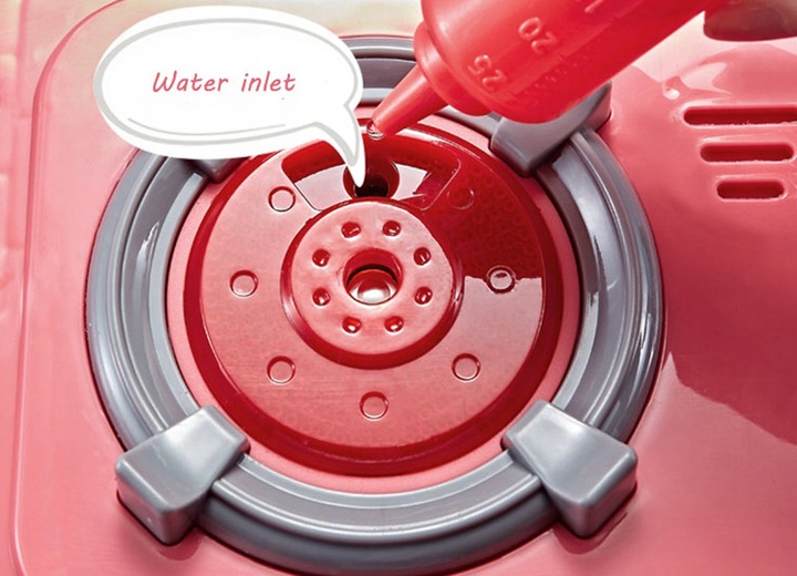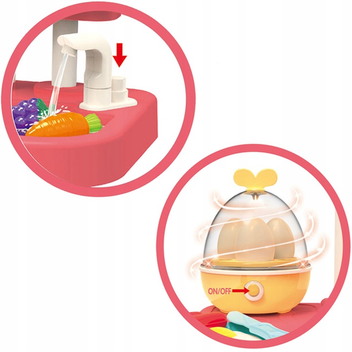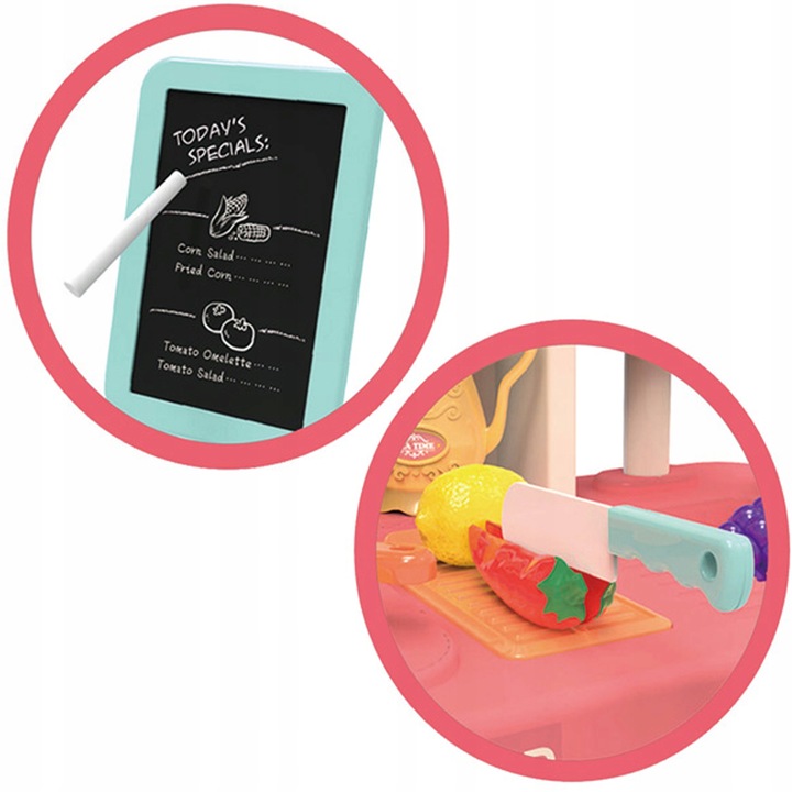 Bucataria are robinet de apa. Cu circuit inchis, apa zboara din robinet prin apasarea unui buton (pompa), care va permite copilului sa joace diverse scene, cum ar fi gatitul, spalarea vaselor sau udarea plantelor.