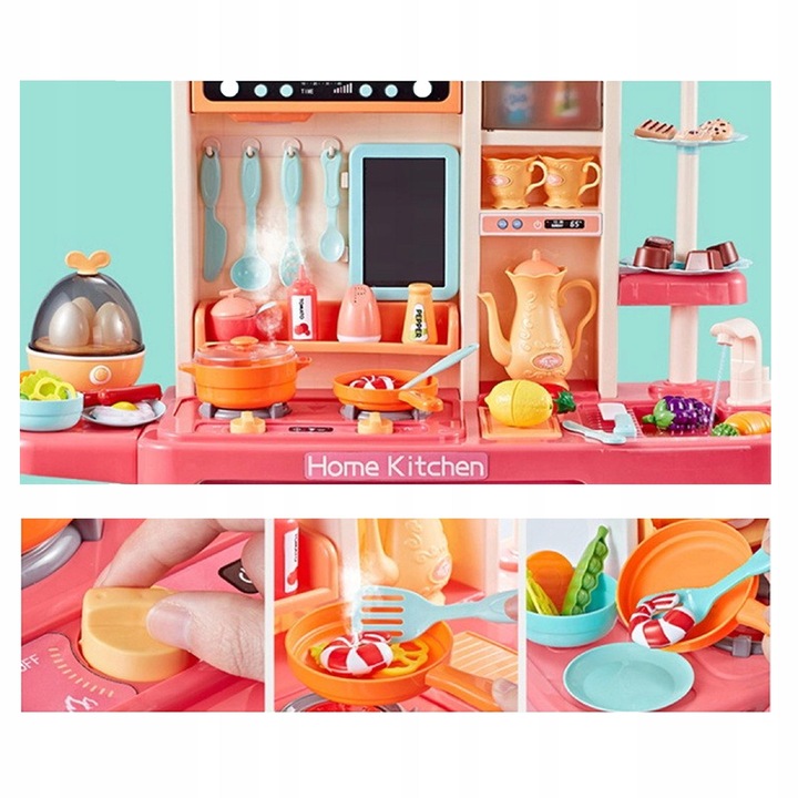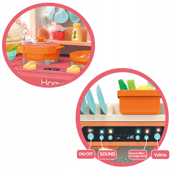 Abur la gatit: bucataria noastra emite abur inofensiv din arzatoare, ceea ce adauga autenticitate si dezvolta imaginatia in timpul jocului. Cei mici vor putea pregati mancaruri imaginare ca adevarati maestri bucatari.