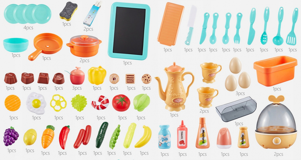 Setul include pana la 65 de accesorii (legume, fructe, oale, farfurii, tacamuri, dulciuri, vesela si multe altele) :