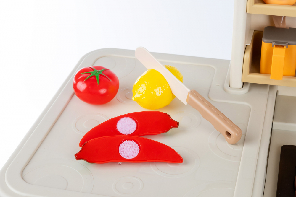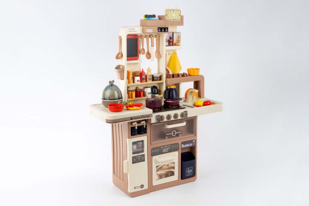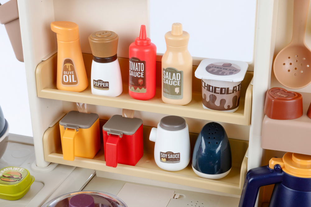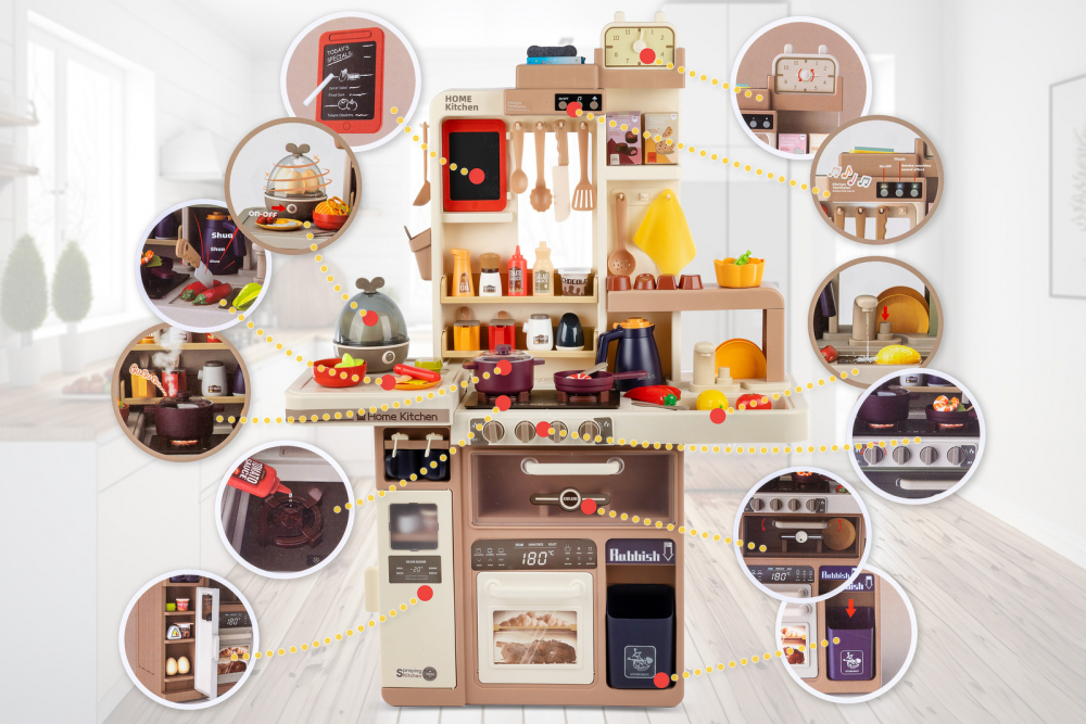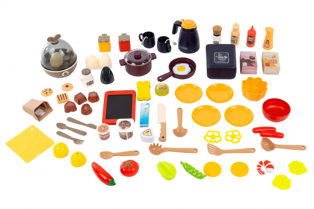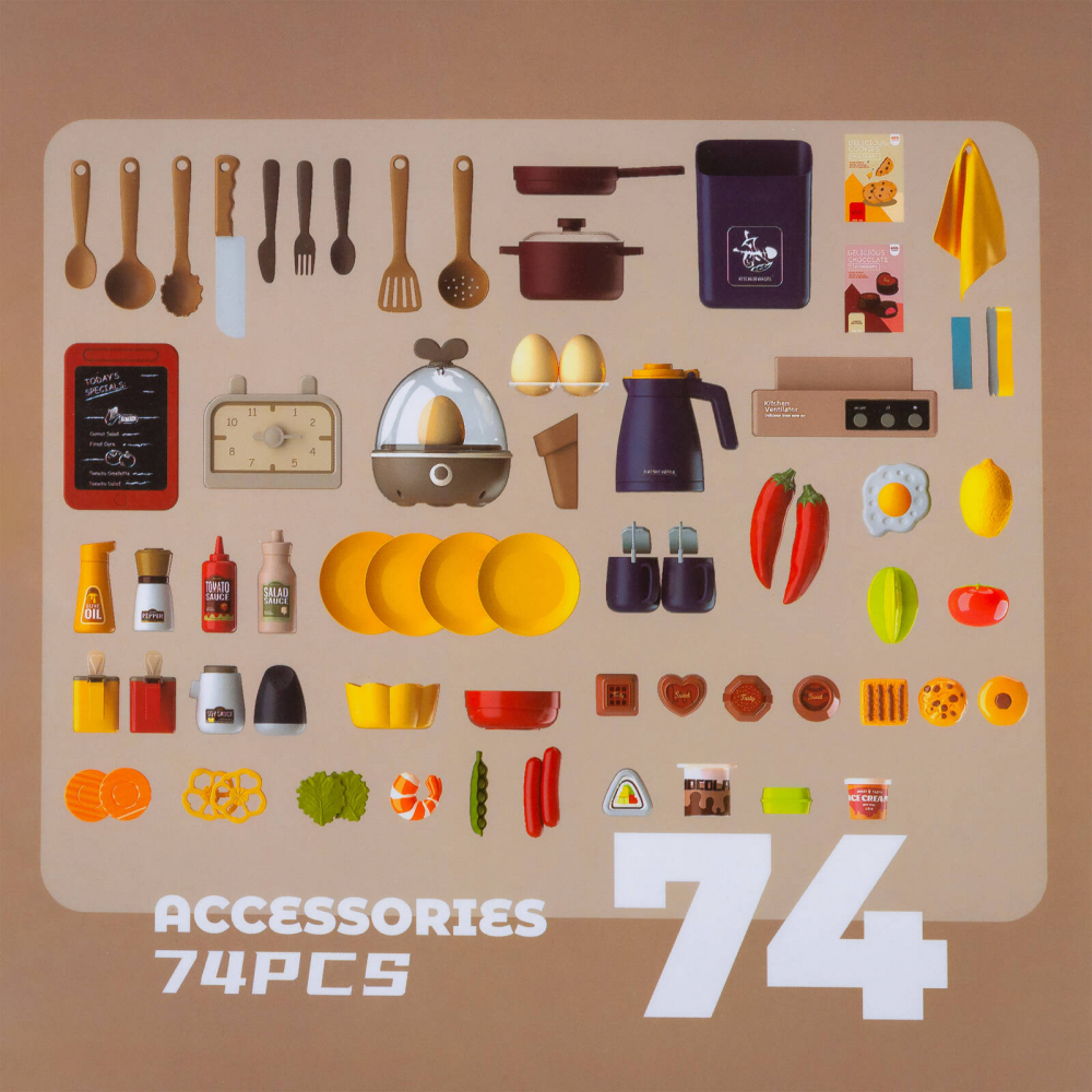 * Bucataria este dotata cu 74 de accesorii, printre care puteti regasi: fructe, legume, oale, cani, ulcioare, farfurii, tacamuri, prajituri, ciocolata, tabla, aragaz pentru oua, ketchup, mustar, piper, lapte