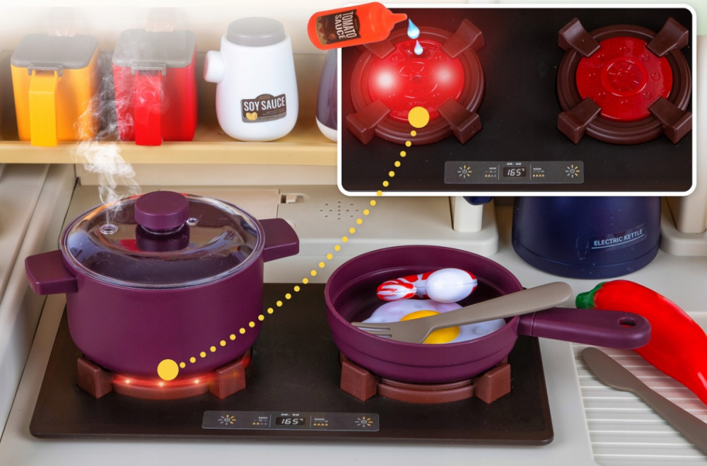 - Cand primul buton este activat, primul arzator se aprinde, luminile sunt aprinse si aburul iese din arzator pentru a imita evaporarea apei. Toate acestea sunt insotite de sunetul apei fierbinti (aburul nu este fierbinte, ci este rece si complet sigur);