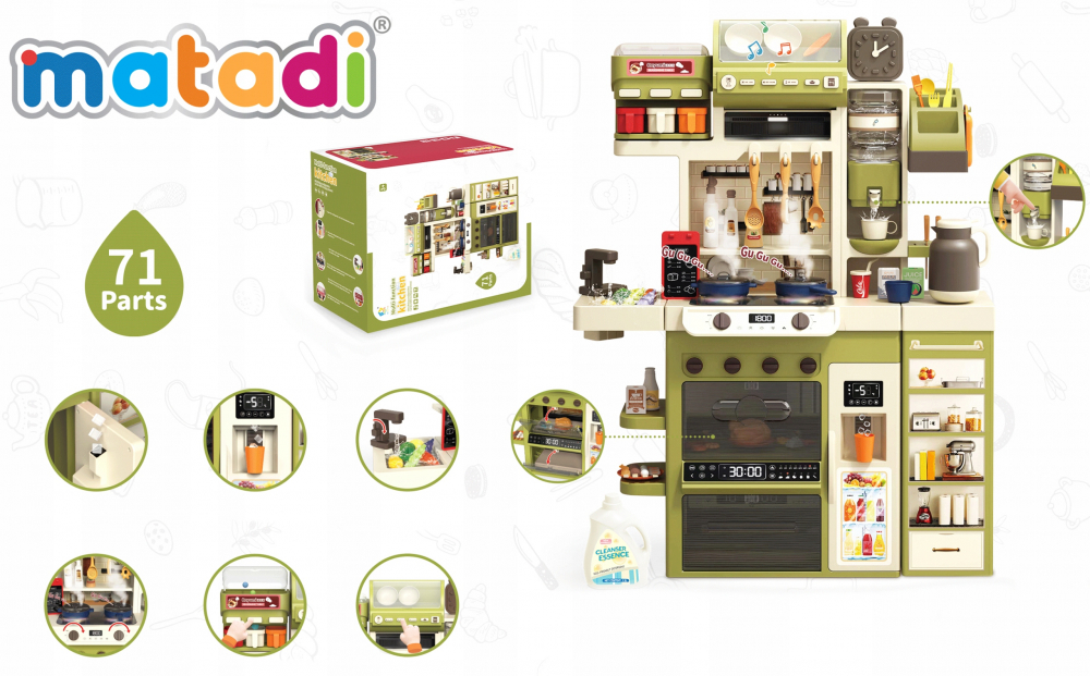 O bucatarie uimitoare cu multe functii, cum ar fi apa care curge de la robinet, lumina si efectele sonore , hota cu sunet si lumini -va vor incanta cu siguranta copilasul, garantand multe ore de distractie.