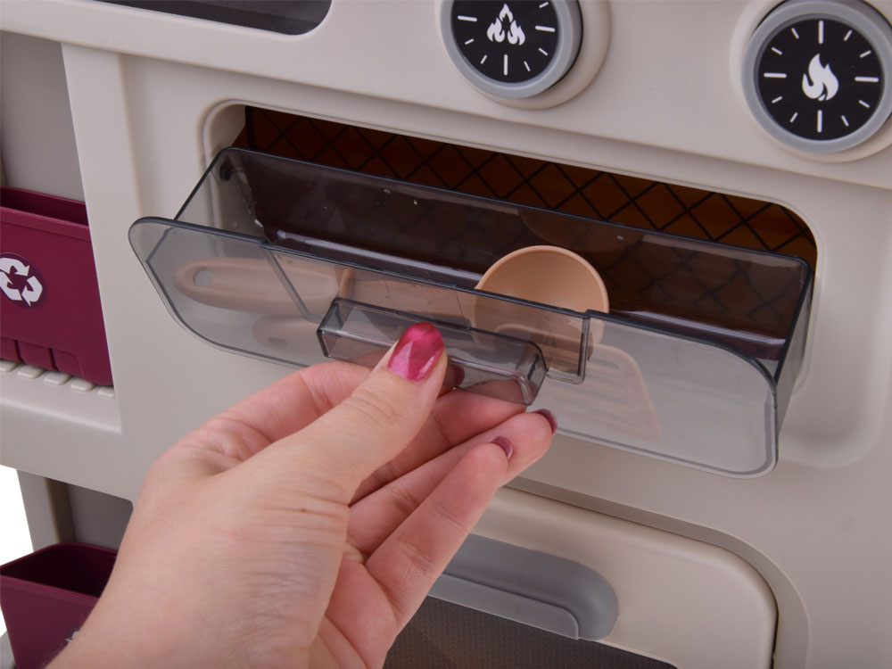 Construita din plastic premium, durabil, si finisata in nuante luminoase si captivante, aceasta bucatarie de mari dimensiuni transforma instantaneu orice camera de copil sau spatiu de joaca.
