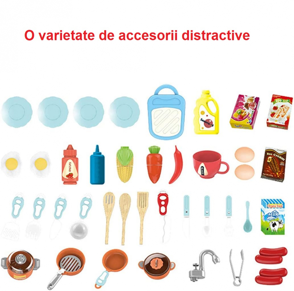 - Un total de 45 de accesorii (fructe, legume, vase, tacamuri, farfurii, prosoape de ceai si altele);