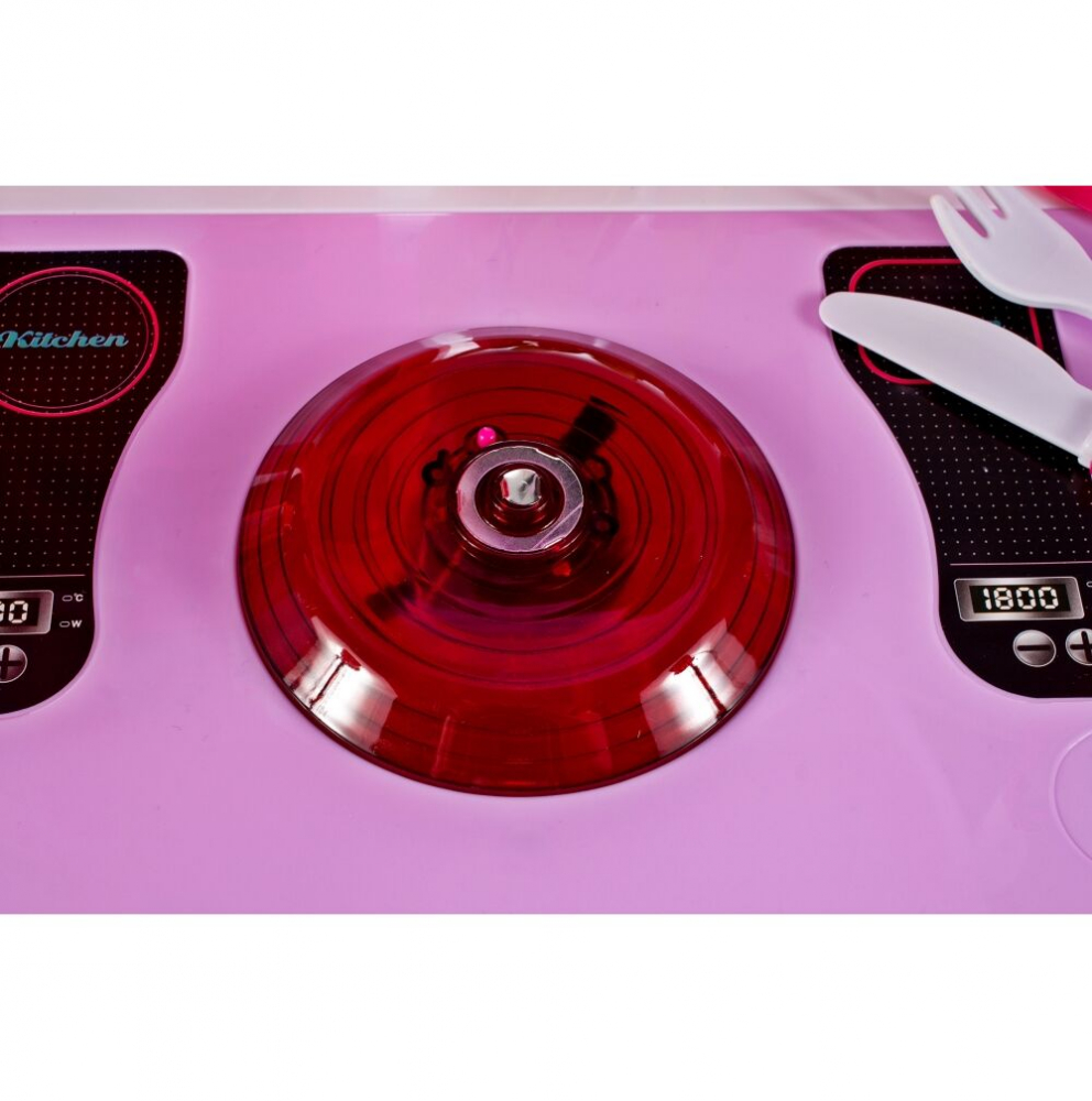 * Fierbătorul inclus în set imită perfect echipamentul real. Doar turnați apă în ceainic, puneți-o pe aragaz și rotiți butonul responsabil pentru plita cu inducție (buton din dreapta). După un timp, din fierbător vor începe să iasă aburi.