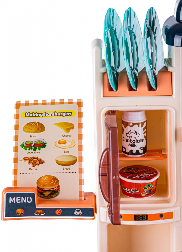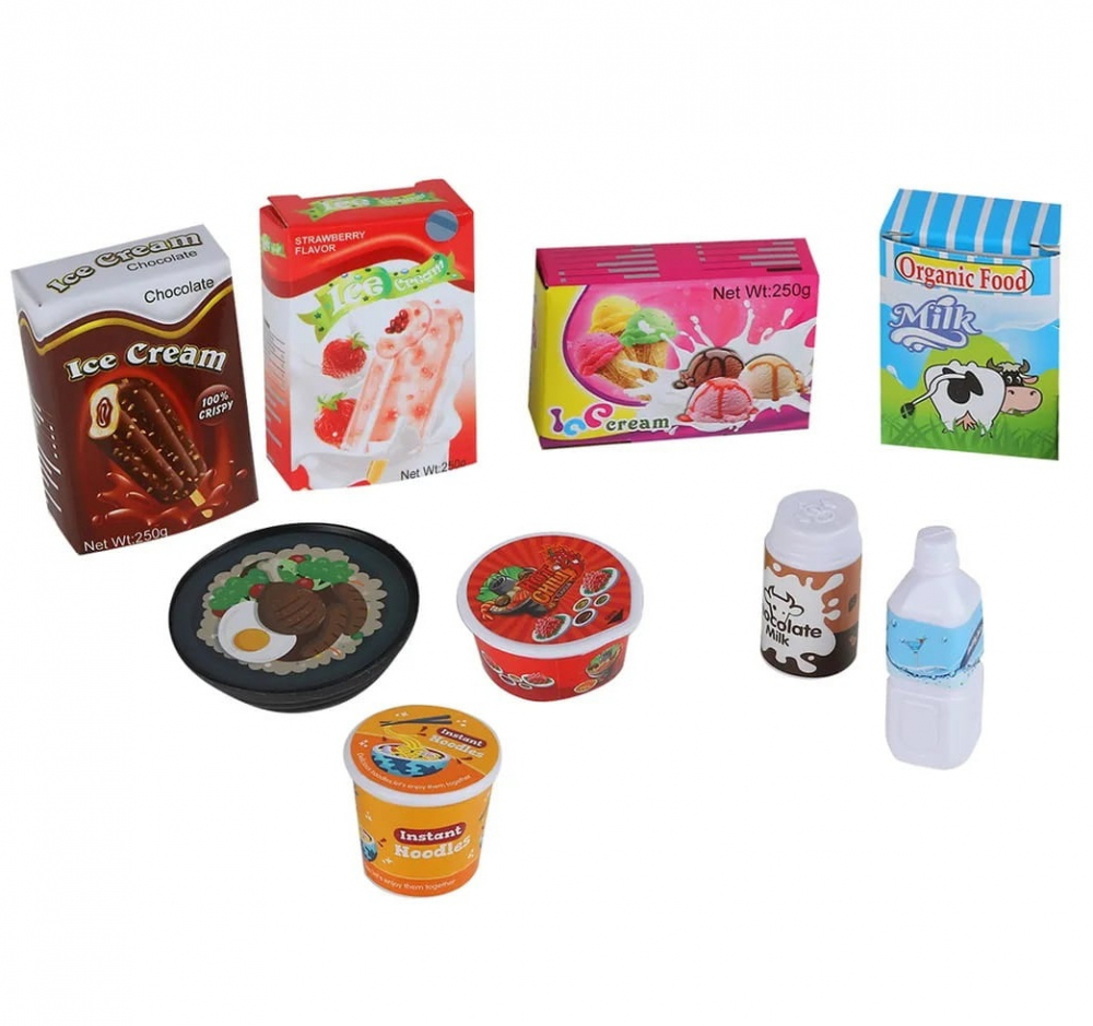 O gama intreaga de feluri de mancare, vase si tacamuri este disponibila pentru mica hostess /gazda. Nici legumele nu au fost uitate,ambalaje din fructe sau carton care imita produsele lactate.