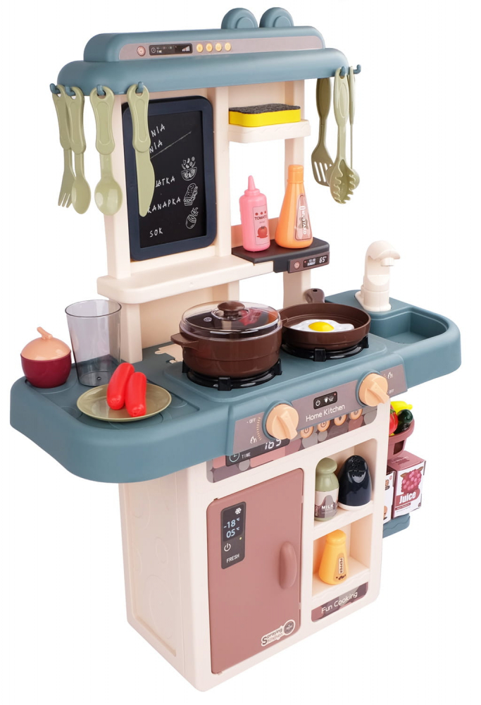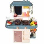 Bucatarie multifunctionala Doris Turcoaz cu frigider si plita cu gaz, 42 elemente, aburi,detalii realistice,alimente si vase de gatit